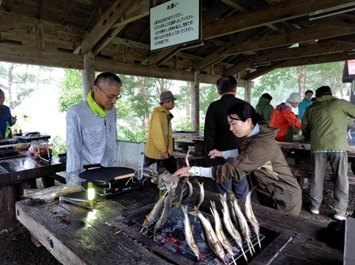 雨は強くなってきており、外でのお祭りは不可能と判断した。皆と相談をし、屋根があるBBQエリアで焚火なしのお祭りを開催することにした。ここでAさんが差し入れをしてくれた鮎を串に刺したり、炭をおこしたり全員協力をしてお祭りの準備を進めていく。