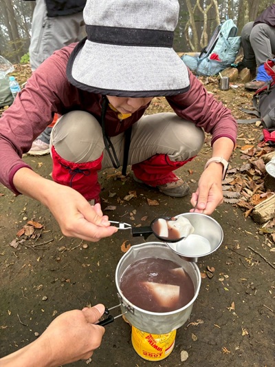 生憎、展望なし。日光の山々が見えるはずなのに…。気を取り直して、山行のメインイベントのお汁粉を作る。お餅は鍋用の薄い物を使用。直ぐに火が通ってなかなか良かった。お口直しのコーヒーも好評!! そして下山、独標でOさんが靴紐を結びなおした時スパッツを外していた。これが悲劇の原因ではないか 。