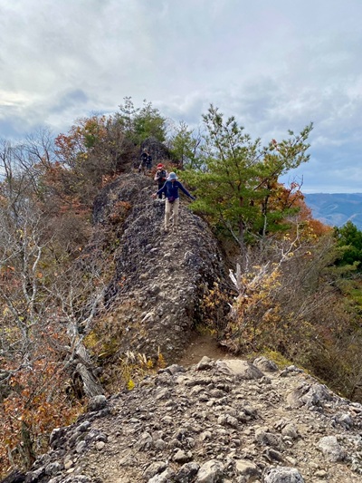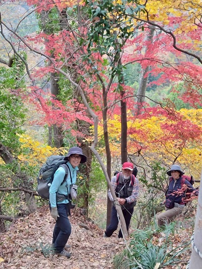 生瀬富士山頂でIさんとは別れ、4人は立神山に向かって下山する。その下山がジャンダルムより最も注意を要するところだが、沢の高巻きを経験していたら(これくらい)大丈夫だわね、とEさん。立神山から後はアップダウンを繰り返すが、次にどんな紅葉が出てくるのかとわくわくしながら下ったり登ったりするので全然苦にならない。