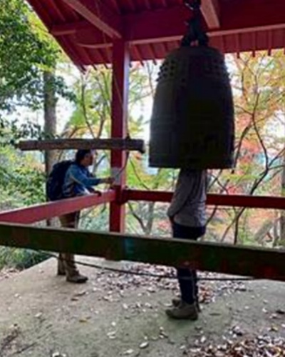 さて、ここからが月居山に続く長い階段である。登っても登っても階段が続くのは体育会系の特訓のようだったが、そうこうしているうちに月居観音に着き、紅葉を背景に鐘を突く。鐘の中では音波が互いに打消されて音が聞こえないというのは本当か? と前から気になっていたというT夫妻。それじゃあ実験してみたら? と言うことになり、鐘の中に一人入って鐘を突いてみる二人の光景には笑いが止まらなかった。