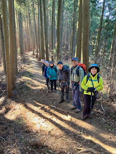 2コースは夕焼小焼バス停からの出発。急行ではなく各停のバスに乗ったので、座席に座ってのんびり向かうことができた。夕やけ小やけふれあいの里分岐で北高尾山稜に取り付くまでに若干の急坂があったが、道が整備されていることでペースよく登ることが出来た。道中、女性メンバーが賑やかに会話をしてくれたおかげで、男性陣も退屈せずに登れたと思う。