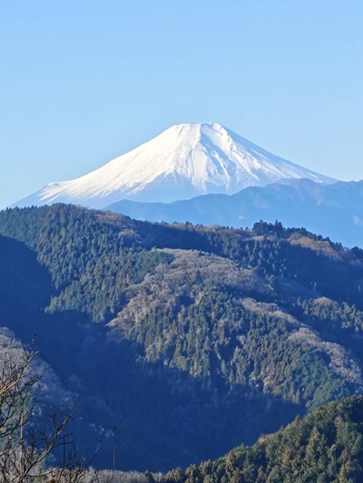 南西方向には雪化粧の富士山が大きく絶景。一方で扇山の火災も間近に見える。風が出てきたので延焼が心配である。山頂では、ウッドデッキに集まっていた団体が退いたので、空いた場所に陣取って昼食を摂っていると、間もなく2コースの7人が現れる。その後、途中のアクシデントで単独行となってしまった3コースのAさんも到着して全員集合となった。